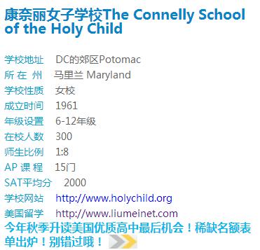 康奈丽女子学校The Connelly School of the Holy Child位于DC的郊区Potomac,是马里兰最富的地区.校内环境优美,课程设置丰富,设施齐全,是马里兰地区最优质的学校之一。