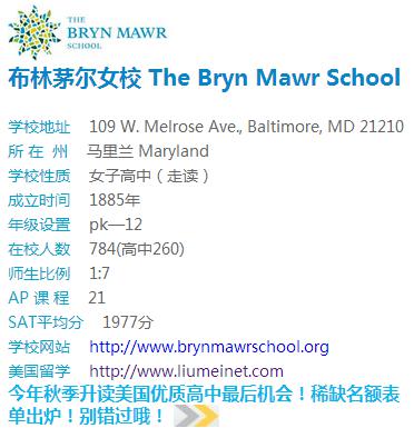 布林茅尔女校 The Bryn Mawr School是顶级贵族女校,独立非宗教大学预备学校。学校严格的课程安排激发了学生对知识的渴求,强调在快乐和兴趣中学习。在保持传统的人文特色的同时,学校致力于心智,身体和精神平衡发展。学校尊重每名学生个性发展,培养学生在遵循伦理和道德下的领导才能和对社区的奉献精神。布林茅尔希望每名女生在面对错综复杂和挑战性环境时能够从容应对,成为负责任和自信的人。美国最早的郊区走读学校之一,建在富人区,硬件设施一流。