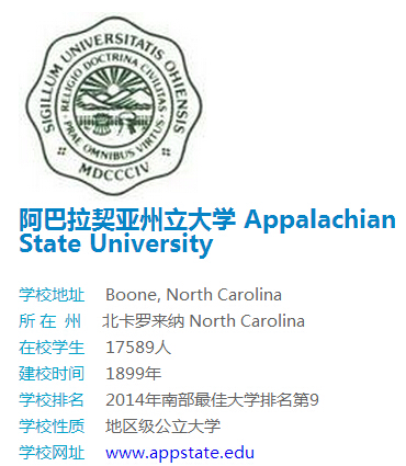 阿巴拉契亚州立大学 Appalachian State University是一所公立的男女同校的大学,成立于1899年,坐落在美国北卡罗来纳州布恩。阿帕拉契州立大学,通常被称为APP State或ASU,是北卡罗莱纳大学系统的第六大机构,也是北卡罗来纳大学系统的一部分。据美国新闻与世界报导,该大学一直排在美国最佳大学指南南方硕士高校前15名。2001年,阿巴拉契亚州立大学被时代杂志评为年度最佳学院。