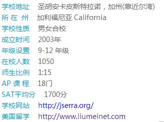 Jserra Catholic High School 建于2003年,是一所私立的罗马天主教学校,位于加州,被橘子郡认可,同时被西部院校联盟和西方天主教教育协会认可。学校接收9-12年级的学生,实行男女合校制度。虽建校时间不长,但在校人数已达1050人,目前有国际学生人数50人。我们的目标是为每一位学生提供空前的学习机会,比如我们的倍受尊敬的基础课程和网络课程,同时在天主教的教义下,提高学生的整体素质。