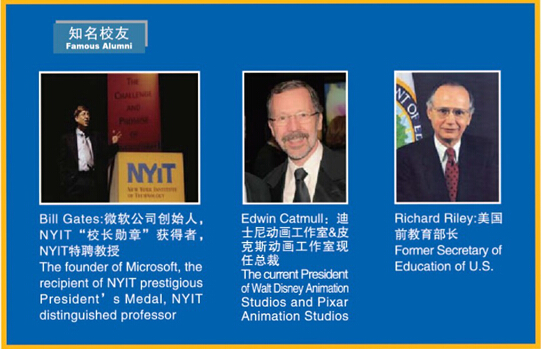 NYIT连年被《美国新闻与世界报道》杂志(US News & World Report)评为全美最好的大学之一。1999年微软公司董事长比尔盖茨在NYIT发表演讲,首次提出“I-Generation”挑战的观念,并被授予NYIT的校长荣誉奖。该校毕业生在北美就业具有影响力,且在个人事业上均有显著成就。该校的优势专业:信息工程,计算机,建筑,设计,传媒,商科,酒店管理,动漫,影视,骨科医学,理疗。