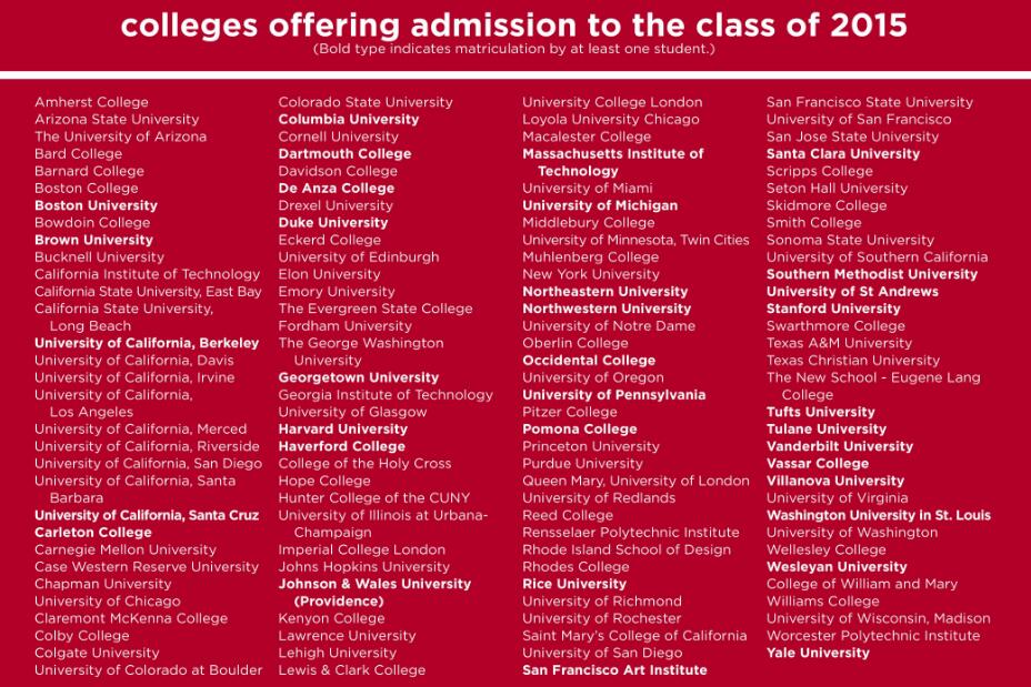 在2015年,卡斯迪加学校学生的AP考试成绩非常优秀,共有127名学生参加了282项AP考试,得分在4或者5的占83%,得分在3分以上的为97%。学生100%的四年大学入学率。2015年,不少学生考入波士顿大学、布朗大学、伯克利大学、哥伦比亚大学哈佛大学麻省理工、宾州大学、斯坦福大学、旧金山艺术学院、耶鲁大学等全美排名前30位的综合性大学和艺术学院。