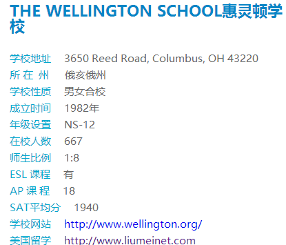 惠灵顿学校建于1982年,是俄亥俄州甚至在全美都首屈一指的独立学校。从排名到称号,从师资到课程,从基础科学到应用科技,从体育项目到课外社团,从SAT到大学升学,方方面面无不凸显这所学校卓越的实力。“哥伦布大区排名第二,俄亥俄州排名第六,哥伦布最佳私立学校”充分体现该校的地位;单年次多达12名教师获得“金苹果教师奖”说明其强劲雄厚的师资;“连续三年被评为哥伦布地区最佳工作场所”表现了校园环境的友善有序,教师的勤恳敬业;“俄亥俄州数学奥林匹克邀请赛总冠军,美国数学联盟线上竞赛全美第一”说明其对基础科学的重视;“机器人项目俄亥俄州排名前五,机器人锦标赛最佳创新奖,全国性科学研究竞赛拔得头筹获得高达10万美金奖金”展示了该校对科技应用的研究成果;“全美空手道冠军,男子高尔夫球俄亥俄州二连冠”说明其对个性化体育项目的支持;“SAT全校平均分超过全国平均分近500达到惊人的1940,ACT平均分高达29,大学升学覆盖所有常青藤及美国顶级名校,人均获得大学奖学金超13万美金”凸显了该校的整体教育成果!这所领军独立学校的教育方式从不盲从,大胆独到敢于做规则的制定者。比如,特有的WES论坛,每周都有各类演讲话题讨论,让学生能随时接触到各类最新理念并有机会为自己发声;独立项目设计让学生能够深入研究让自己入迷的课题并公开展示研究成果;自定义课程让学生能接触到的课程领域无限放大并感受真正的因材施教;AP课程改革让学生的课堂教育不再应试而真正聚焦在课题研究的深度上;全球公民认证项目让学生能从各种角度真实的认识世界;大量个性化课程如“解剖生理学,免疫学,癌症研究,天文学,电影制作,玻璃艺术,精神医学,设计,应用软件开发等等”为学生提供更丰富更专业的学术资源。只有足够强大的学校才能获得如此多领域的荣誉并领衔高中教育革新。这所设施超级先进的豪华校园位于哥伦布著名的富人区,目前只有5名中国学生,每年仅开放少量名额,但若有机会遇此等学校不申请还在等什么!
