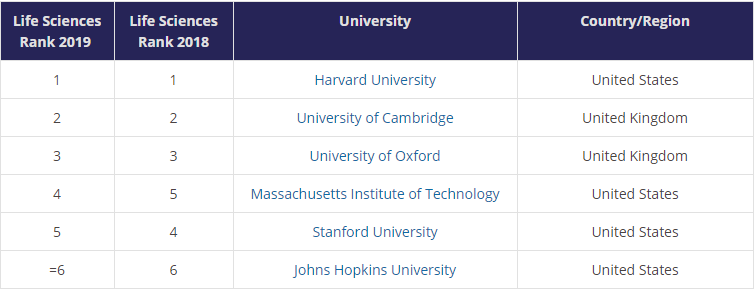 2019年全球最佳生命科学专业排名