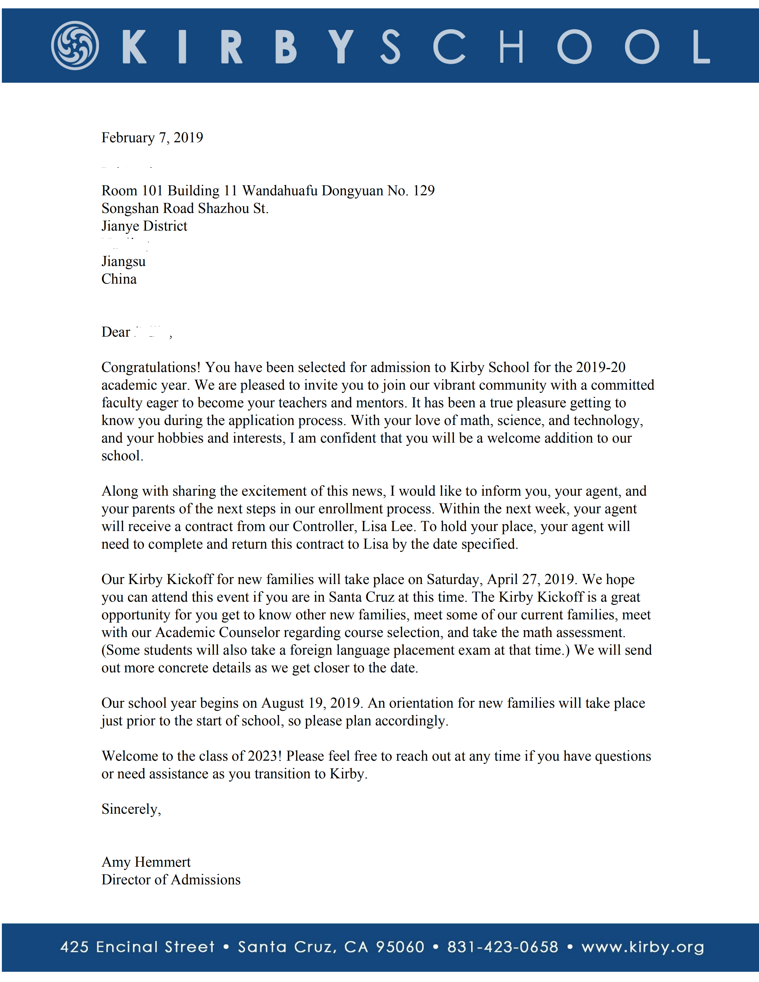 恭喜L同学收获乔治安娜布鲁斯卡比预科学校录取