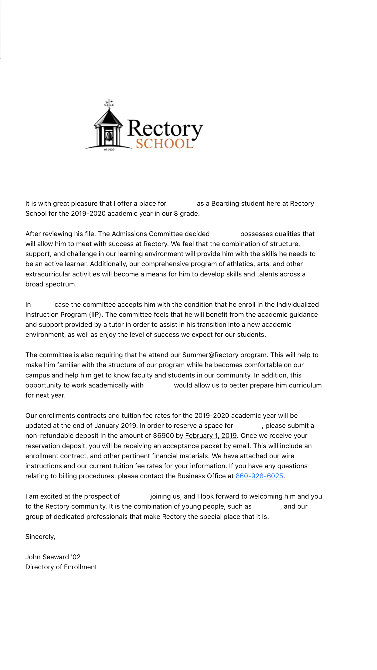 在为做面试培训中,发现该生口语不错,但是羞于表达,而且对很多面试问题没有具体思路,回答问题重点不够突出,逻辑不够清晰。在培训过程中,文案老师就每个问题耐心地引导孩子的思路,如何去回答。该同学也特别认真努力,反复培训几次后,发现该同学进步非常大。在面试不久后成功被自己理想的学校瑞克特瑞中学录取。(涉及个人隐私已经打码处理)