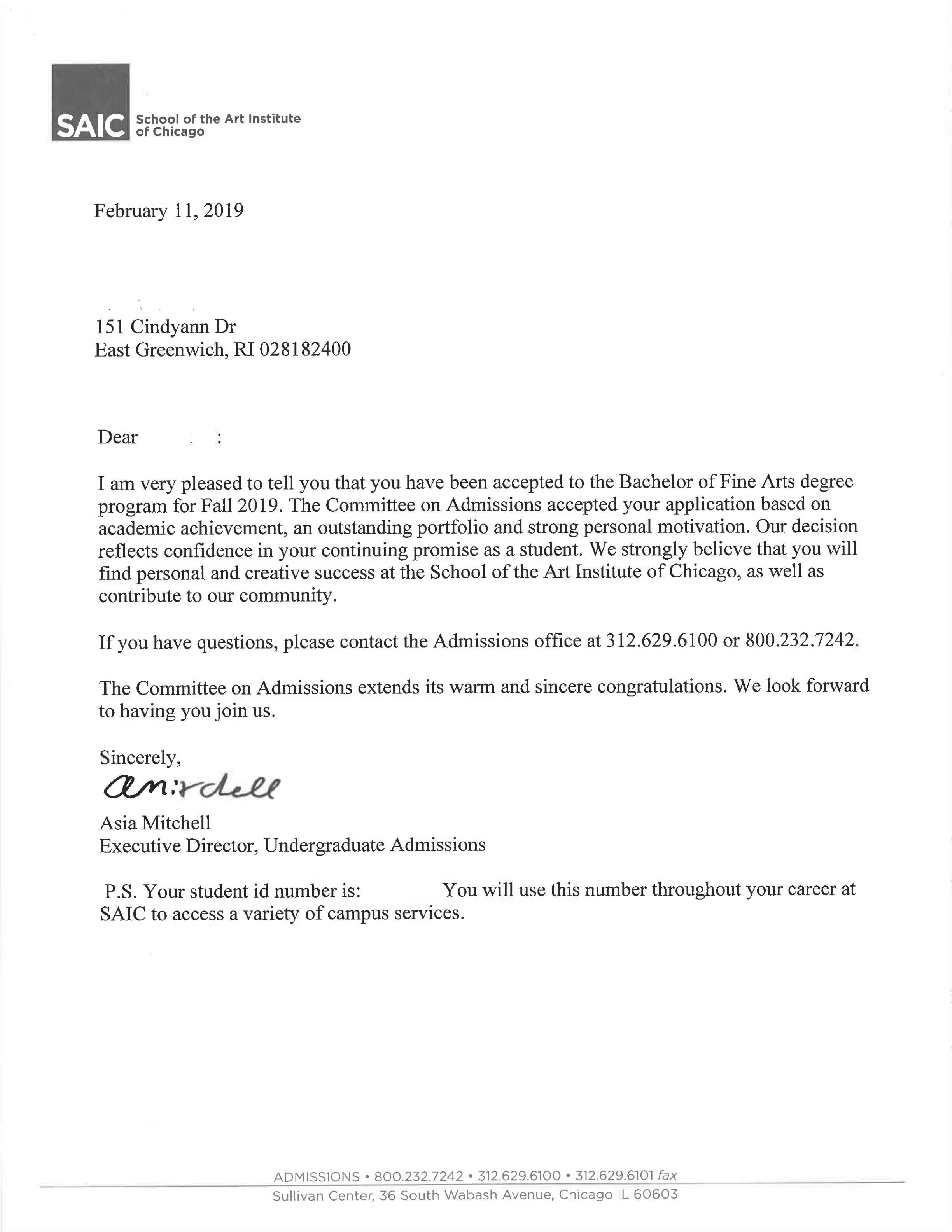 张同学的作品集完成与学校的作品集提交日期较近,文案老师抓紧时间与学生进行沟通并了解其制作作品集时的想法后,拟写学生的创作文章。经过顾问老师、文案老师、学生等的共同努力,张同学成功地被她的理想学校 – 芝加哥艺术学院所录取。