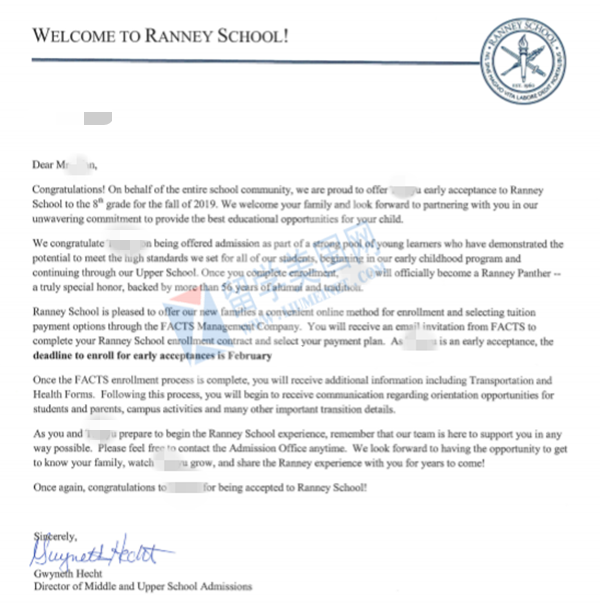 留美网Y同学被兰尼学校录取展示~