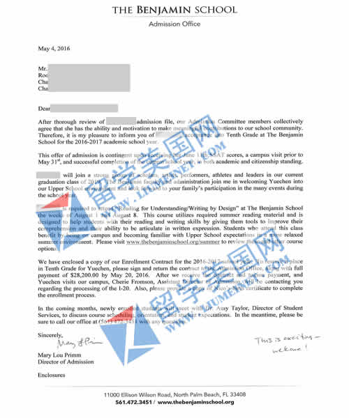 选校出来后,裴同学就把目标定在了本杰明学校。一方面,裴同学兴趣广泛,热爱运动,尤其擅长篮球和网球,对高尔夫也充满兴趣。爵士鼓,钢琴等乐器也是信手拈来;另一方面,裴同学爱创新,爱发明,对科学充满好奇。裴同学曾两次参加国际发明展,荣获三项大奖。本杰明学校正好在裴同学擅长的领域都很突出,因此裴同学毫不犹豫的向本杰明“发起进攻”,经过申请,培训,网络面试,亲自参观校园,裴同学终于拿下了梦寐以求的本杰明offer!裴同学一直以来目标明确,她的成功来自于她的性格、爱好,以及最重要的努力,我们都非常开心她能进入自己喜爱的学校,也希望她在赴美后能尽快适应新环境,在新学校里开创一片新天地,取得更大的成功!