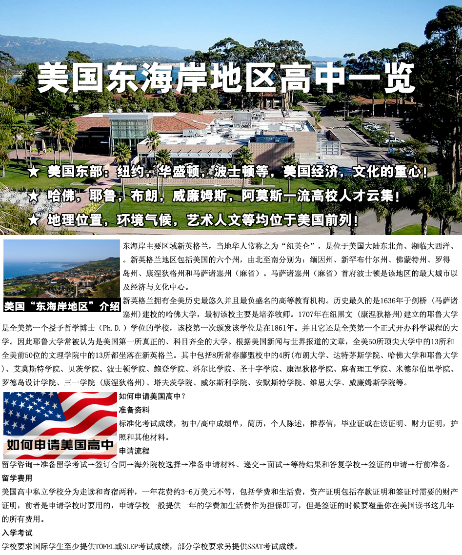 | Washington Academy 华盛顿中学 | 缅因州 | TOEFL或SSAT | 男女合校(寄宿) | 9-12年级 | 在海边,历史悠久。离加拿大近。 |