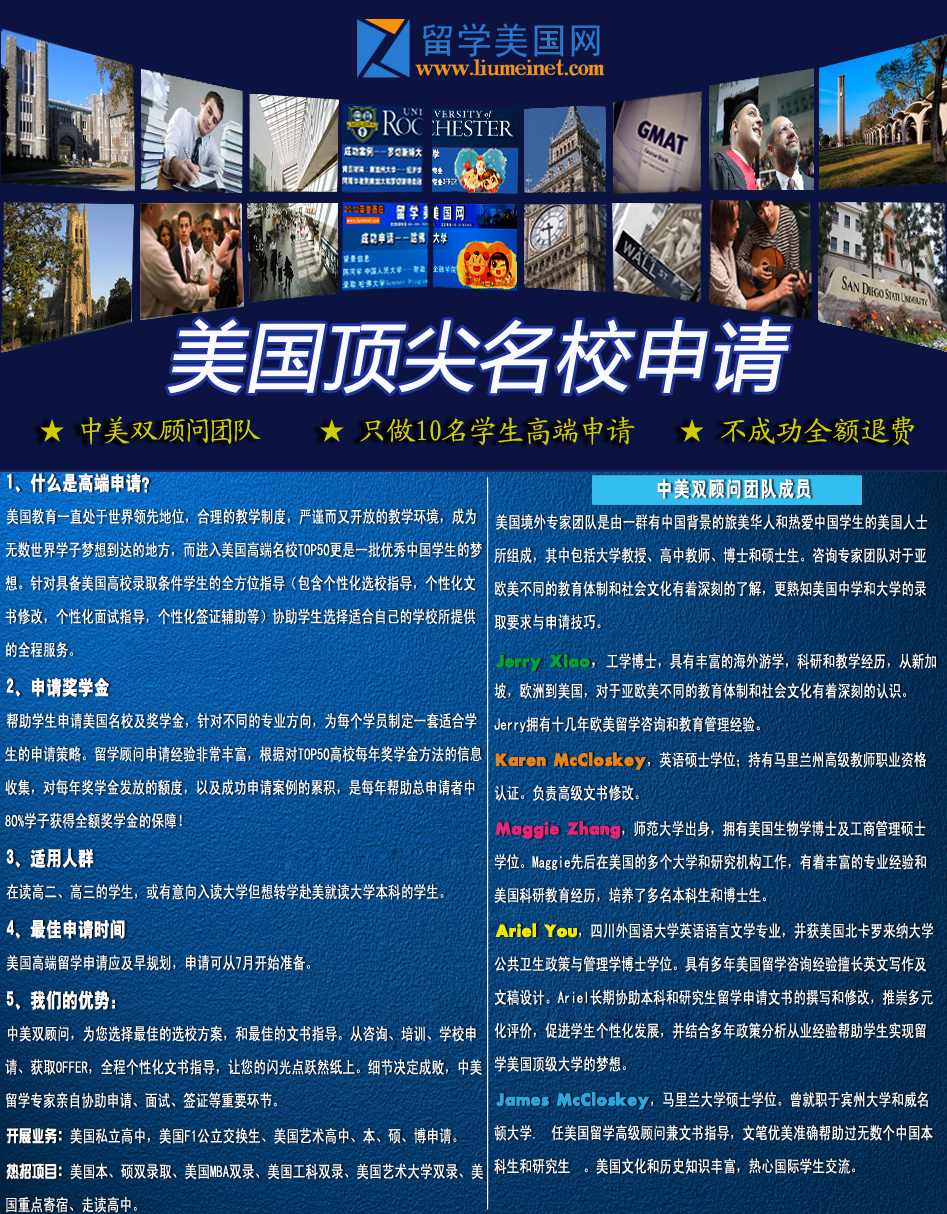 本科在读留学方案设计: 在国内先考TOEFL/SAT,获得满意的分数后根据学校学分的评估结果,转入相应TOP50的高端院校进入本科学习。美国留学: |